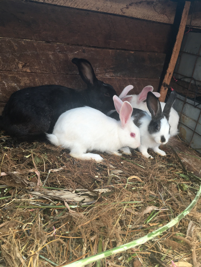 Four rabbits are observed within a wooden and wire enclosure in Ndeiya, Kenya. A large black rabbit rests in the rear, positioned facing left. In front of it, a pure white rabbit with red eyes faces r…read more