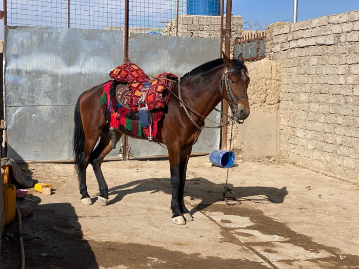 A brown horse with a black mane and tail stands in an outdoor yard within the city of Kandahar, Afghanistan. The horse is equipped with a dark leather bridle featuring metal ornamentation on its foreh…read more