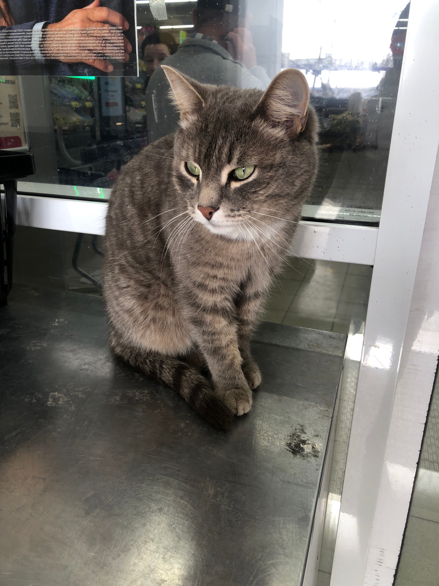 A gray tabby cat is sitting curled up on a metallic surface near a window. The cat has green eyes and white whiskers. Part of a poster or advertisement is visible through the window, showing a hand an…read more