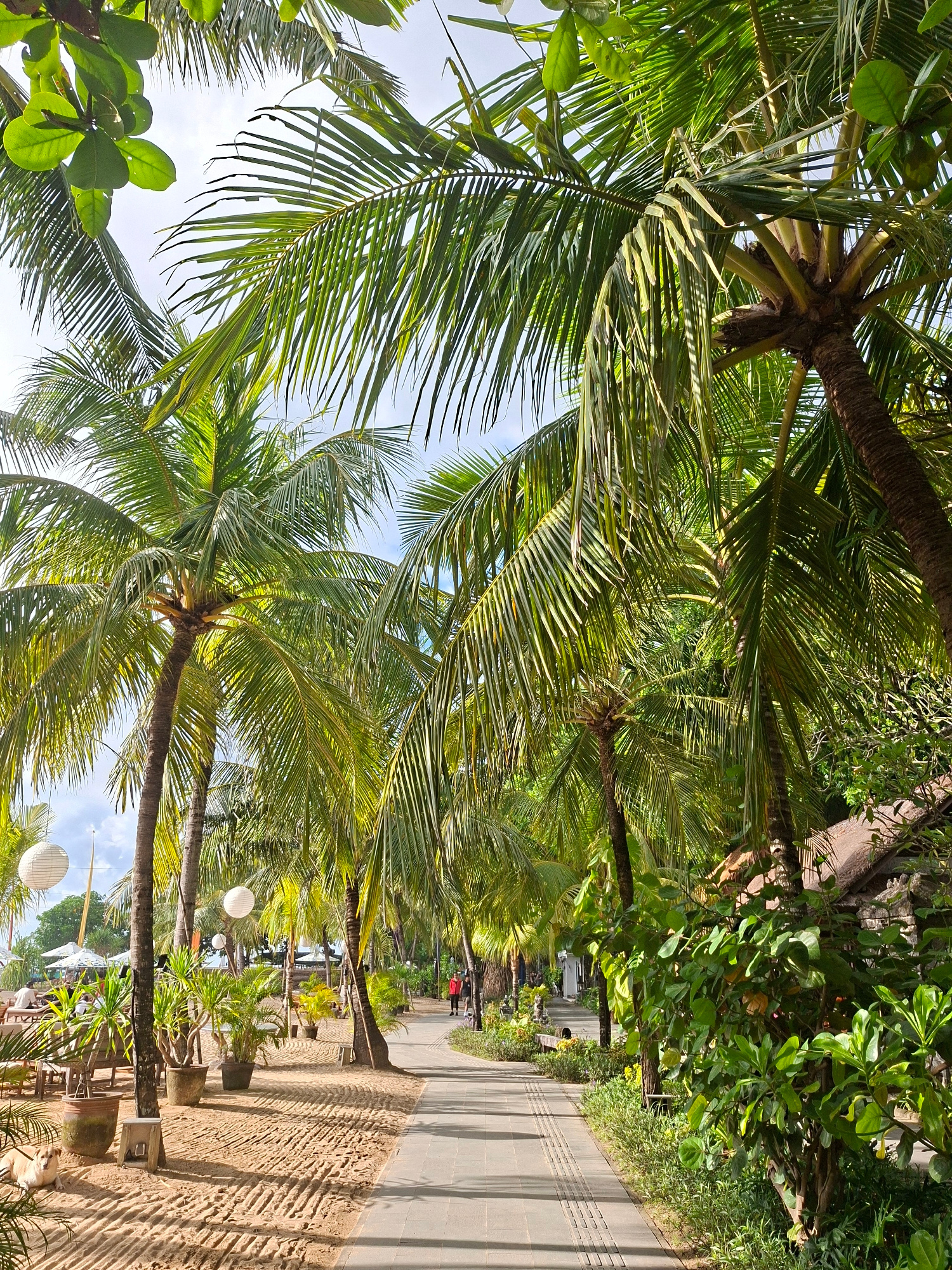 The image depicts a tropical scene in Denpasar, Indonesia. Tall palm trees line a pedestrian walkway, with sand adjacent to the path. A paved section runs parallel to the sand, with people visible in…read more