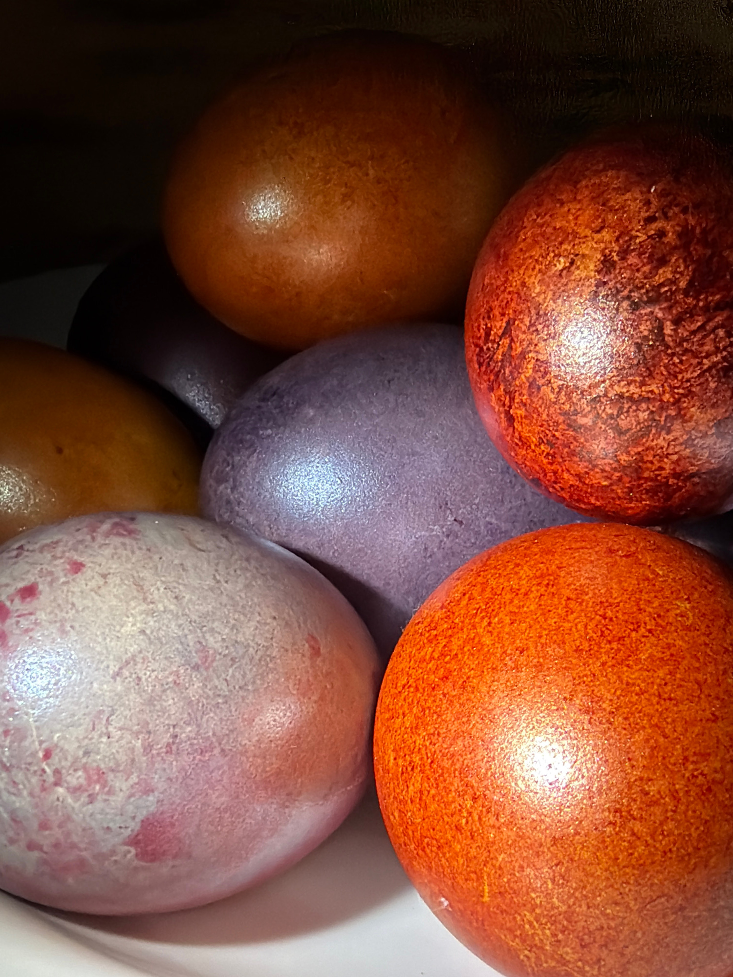 A high-angle, close-up shot shows a cluster of six colorful, shiny Easter eggs nestled together in a bowl. The eggs have a variety of colors and surface textures. One egg is a mottled reddish-brown; o…read more