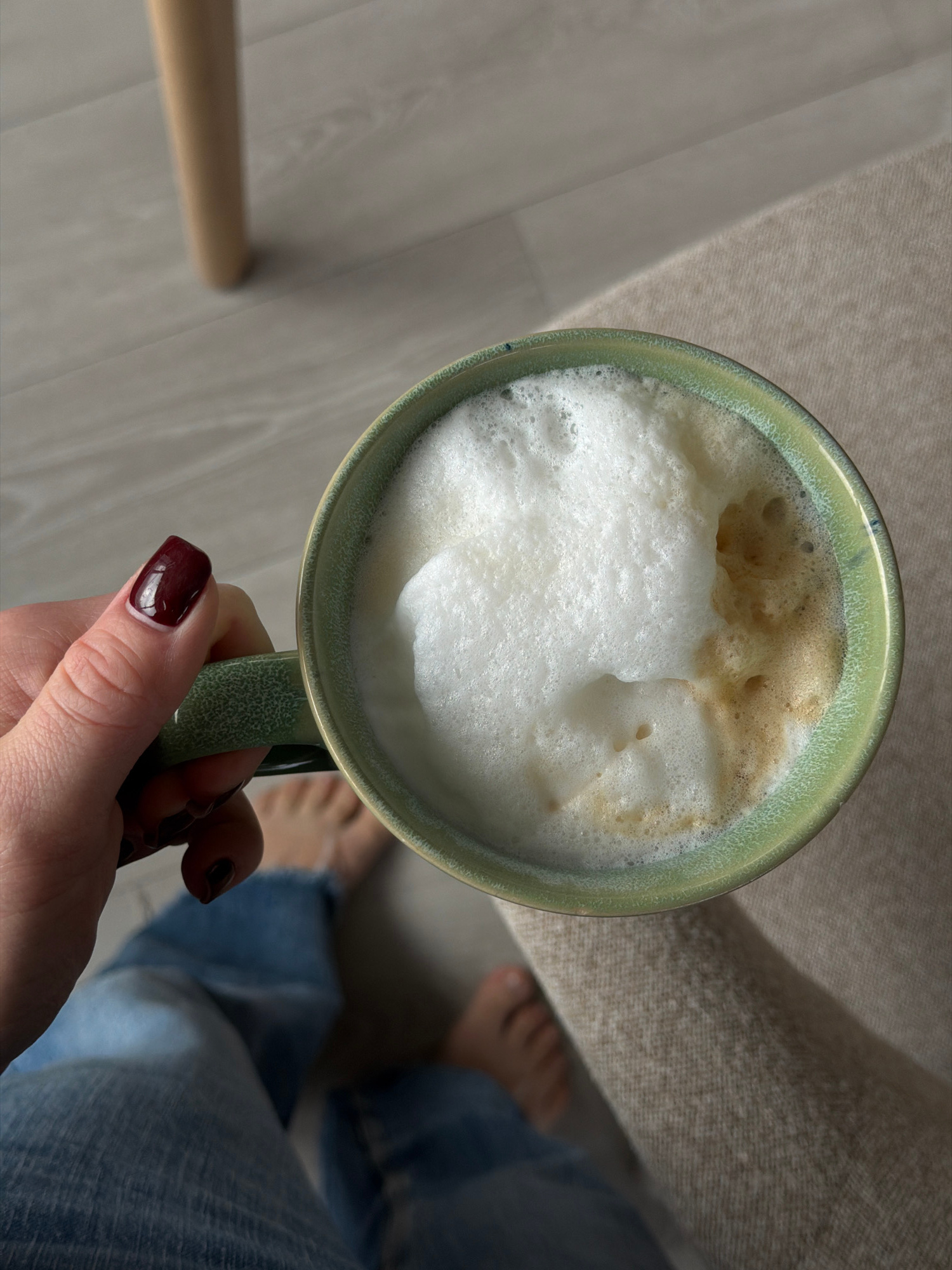 A person is holding a green mug filled with foamy coffee. The person is wearing blue jeans and has dark nail polish. Part of a wooden chair leg is visible on the left. Bare feet are visible in the bac…read more