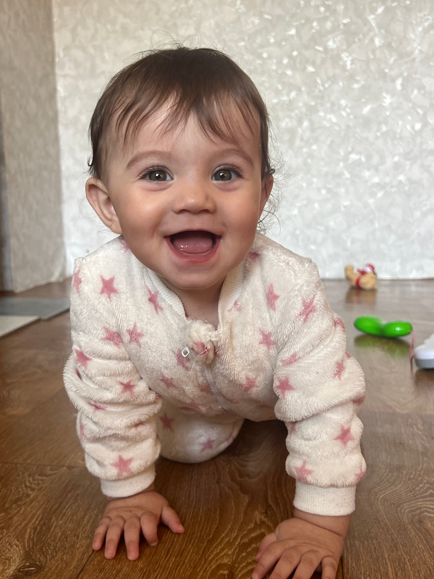 A baby lies on the floor, dressed in a white, star-patterned outfit, smiling with an open mouth. The floor is made of wooden panels, and the wall is white. Toys are scattered nearby. The location cann…read more