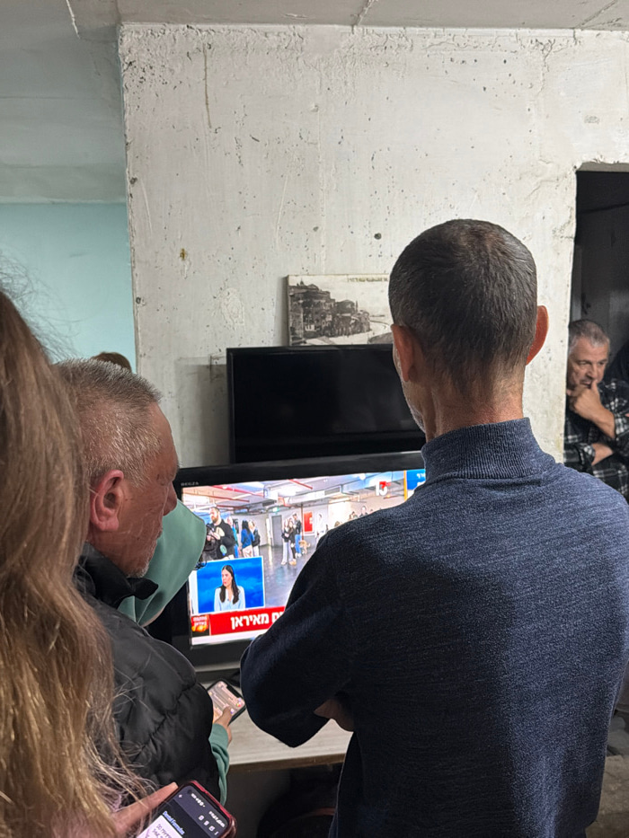 This image depicts an indoor scene in Tel-Aviv, Israel, where a group of individuals is gathered, observing a television news broadcast. The setting appears to be a utilitarian room with rough, light-…read more