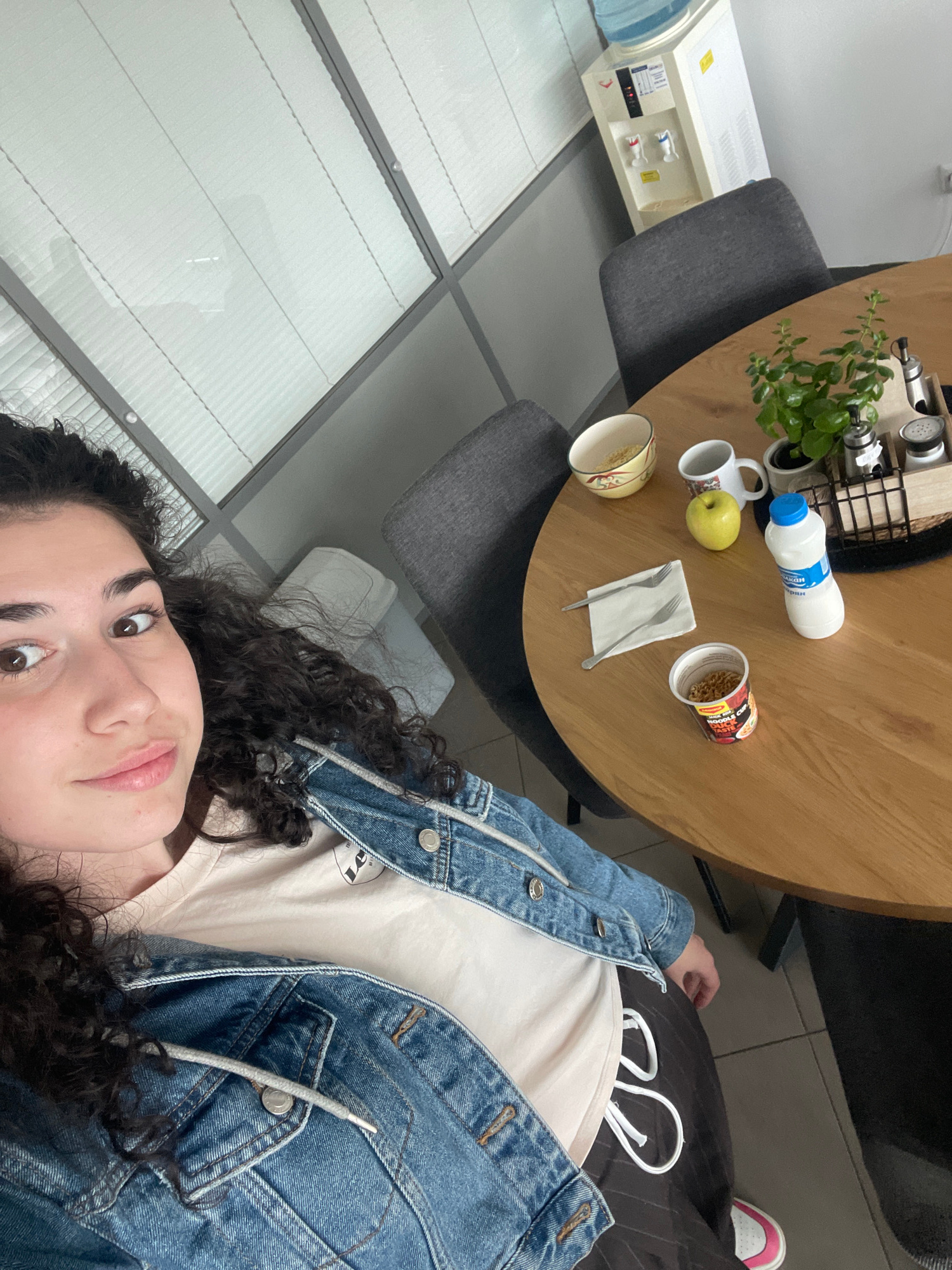 The photograph appears to be a selfie taken indoors, possibly in an office or co-working space. The focal point is a woman with curly dark hair wearing a light-colored t-shirt and a denim jacket. She…read more