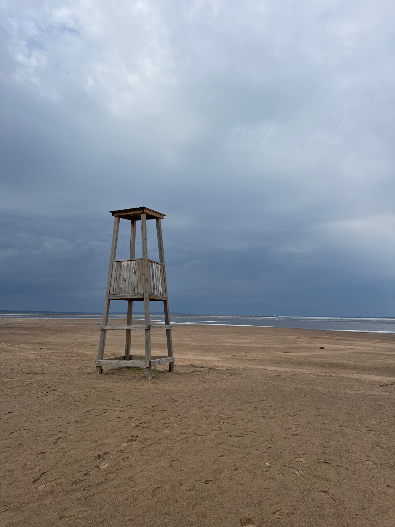 The image depicts a desolate beach scene in Chaikovsky, Russia. A weathered, wooden lifeguard tower stands alone on the sand, its slats partially blocking the view of the ocean. The sky is overcast wi…read more