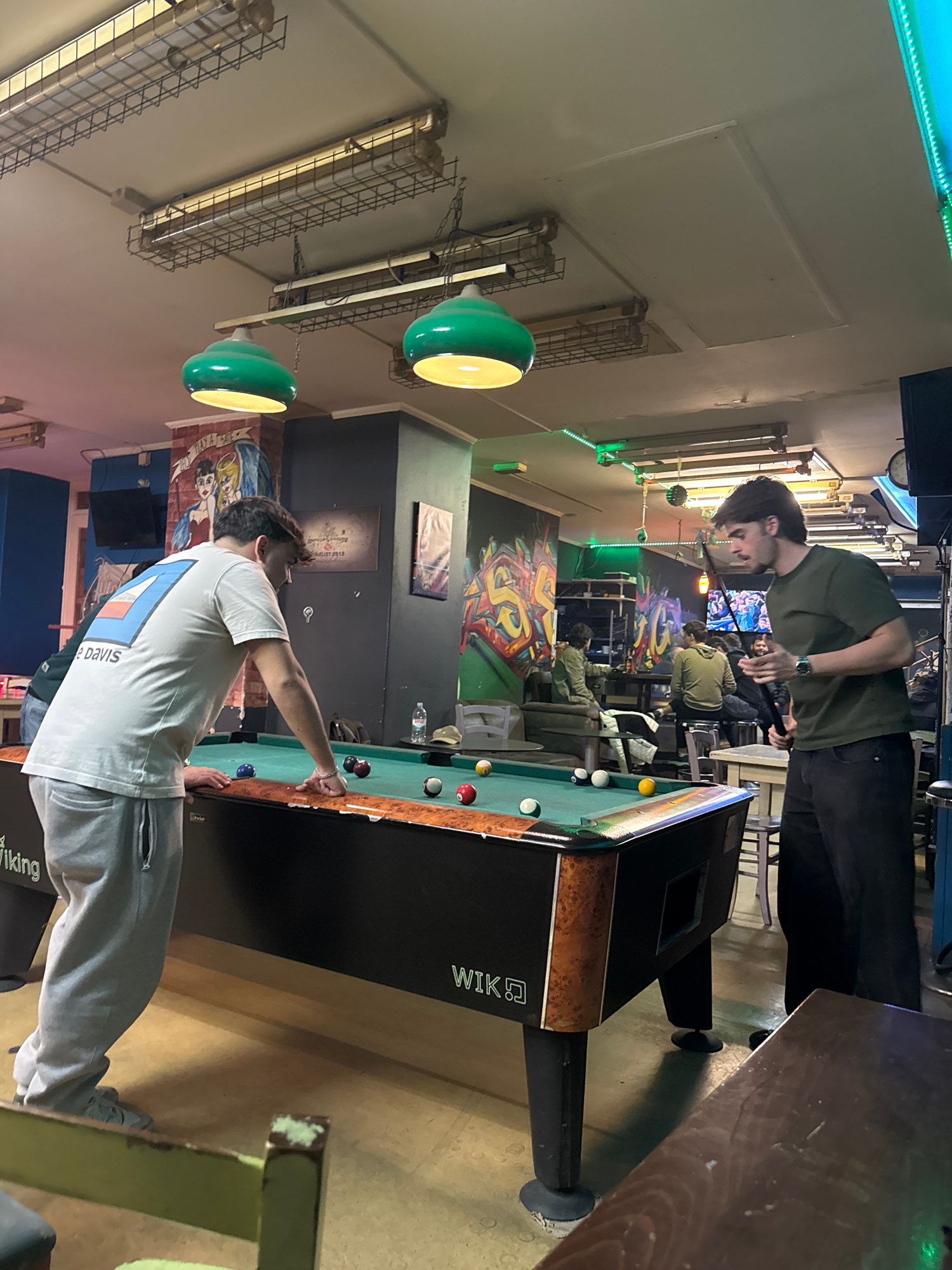 Two men are playing pool in a room with graffiti art on the walls, fluorescent lighting, and hanging lamps. The pool table is branded "Wik-5". A wooden table sits to the right of the pool table. The l…read more