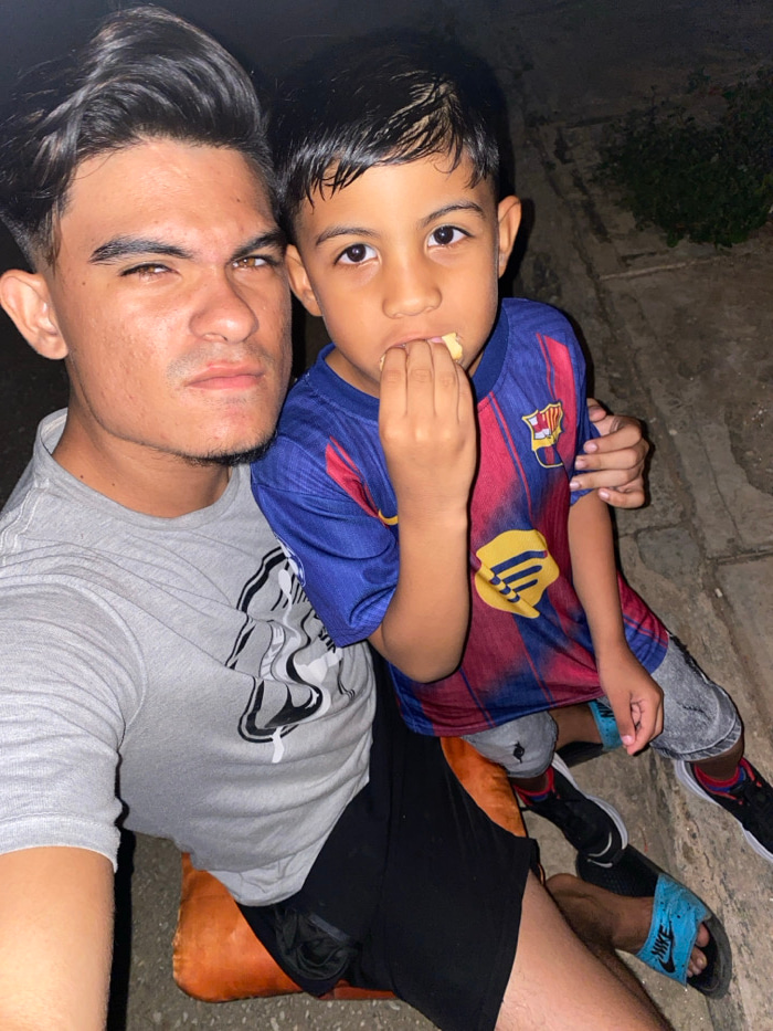 A man and a child are outdoors at night. The man is lying on his back wearing a gray shirt and black shorts, and the child is lying on the man's chest. The child is wearing a blue and red soccer jerse…read more