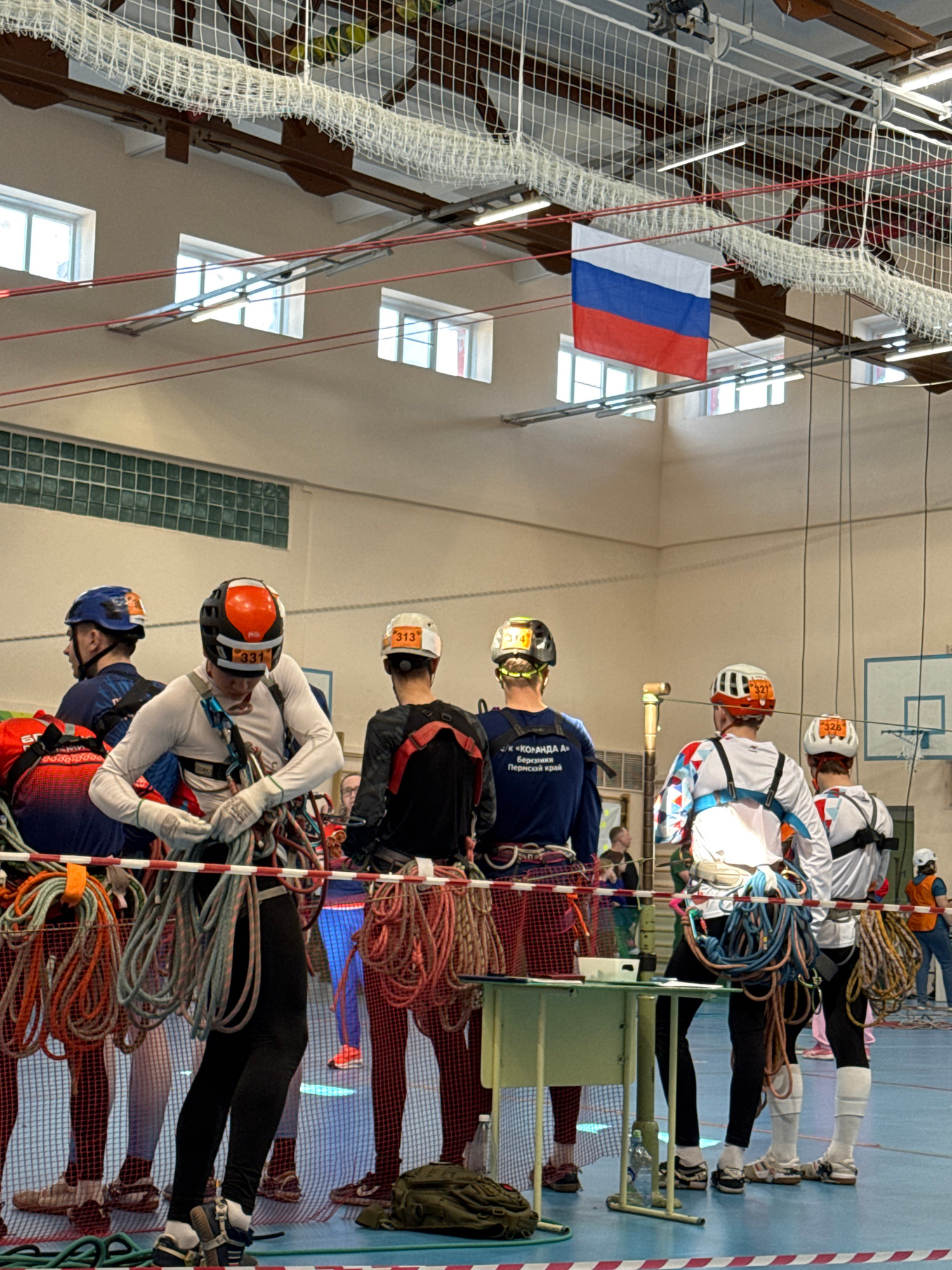 The image shows an indoor setting, possibly a gymnasium, with a group of people engaged in what appears to be a climbing or mountaineering exercise. Several individuals are wearing helmets and harness…read more