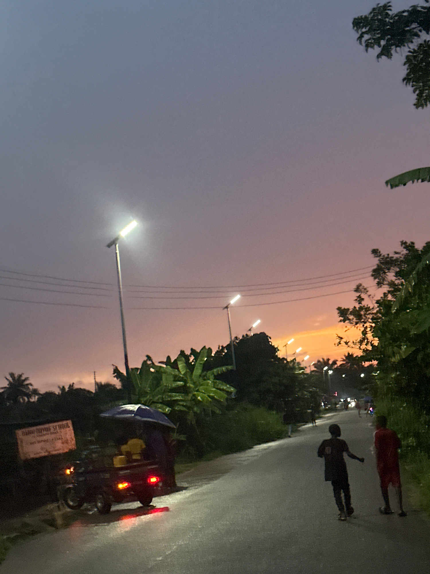 The image depicts a road in Ikot Ekpene, Nigeria, at dusk or dawn. The sky has gradients of gray, pink, and orange. Two people are walking along the side of the road. There are evenly-spaced electric…read more