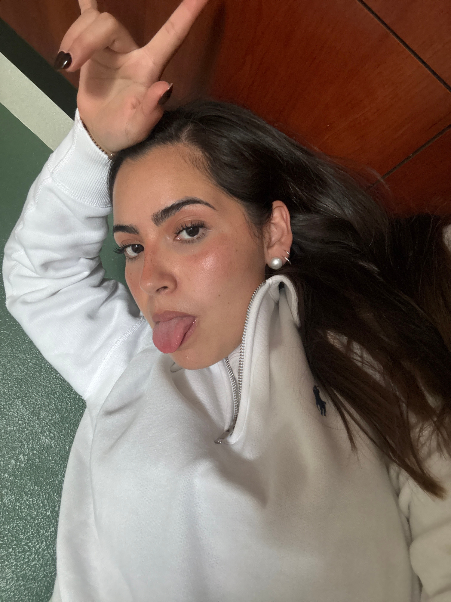 A young woman is lying on her back with her head tilted, sticking her tongue out. She is wearing a white zip-up jacket. Her hair is dark brown and long. She is wearing pearl earrings and has dark fing…read more