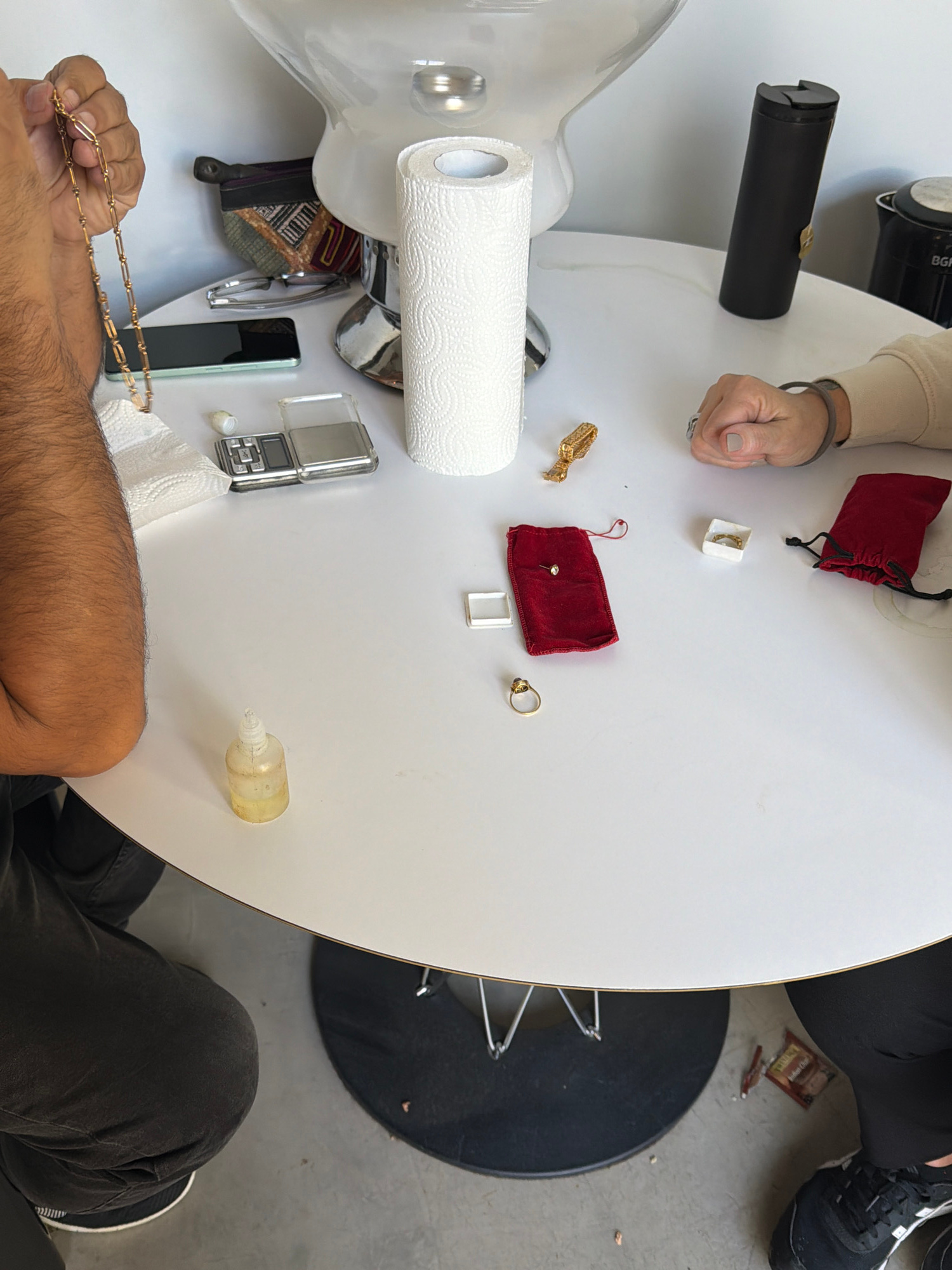 A high-angle, slightly rotated photograph depicts a white, round table surface with various items scattered across it. The view is from above, capturing portions of two seated individuals along the ta…read more