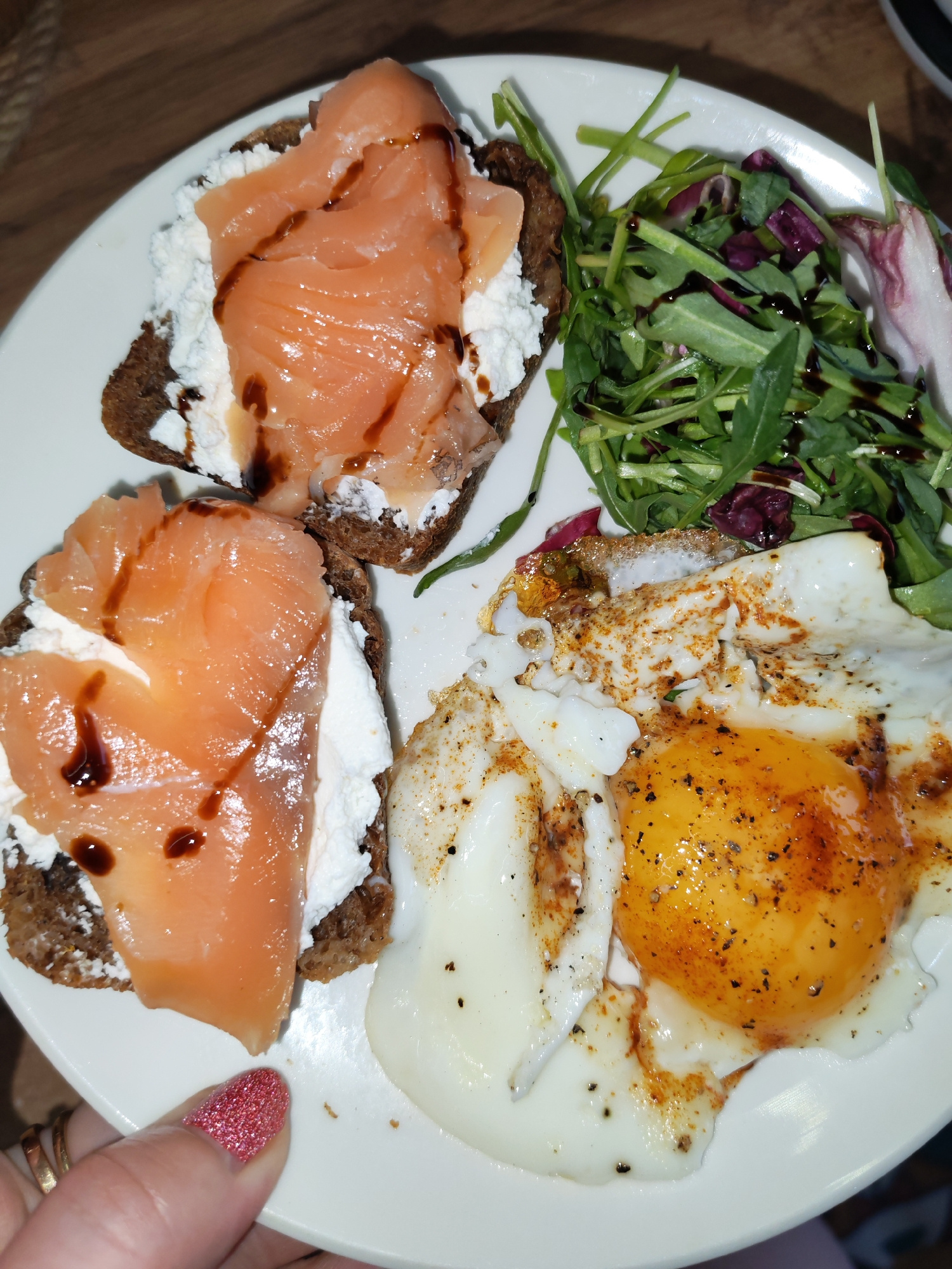 A top-down shot captures a freshly prepared meal, likely breakfast or brunch, served on a white round plate. The composition suggests an indoor setting, possibly in Izhevsk, Russia. On the left side of the plate, there are two small, roughly square slices of dark bread, which appear to be rye or whole grain. Each slice is topped with a generous spread of white, creamy cheese, resembling cottage cheese or ricotta. Laid over the cheese are several delicate, pink slices of smoked salmon, artfully drizzled with a dark, glossy sauce, likely balsamic glaze. Adjacent to the salmon toasts is a fresh green salad, composed primarily of arugula and hints of reddish-purple radicchio, also lightly dressed with a dark vinaigrette. Below the salad and next to the toasts is a perfectly cooked fried egg. It features a bright, round, runny orange yolk surrounded by a crispy-edged white, seasoned generously with black pepper and a reddish spice, possibly paprika. A hand, adorned with sparkling red nail polish and two gold rings on the ring finger, holds the edge of the plate, suggesting the meal is ready to be eaten. The background shows a warm, wooden surface, likely a table. The lighting is artificial and warm, illuminating the food. There is no visible text. | Open Wire