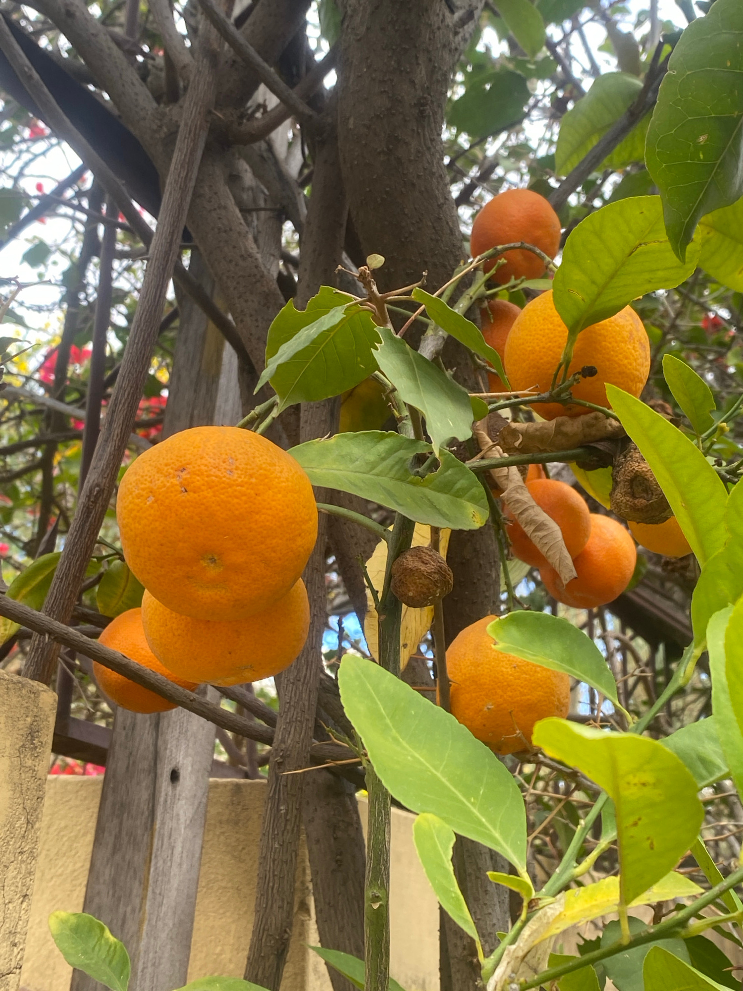 This close-up image displays a vibrant cluster of ripe citrus fruits, most likely oranges, hanging from their branches. The fruits are bright orange with a textured rind and are distributed throughout…read more
