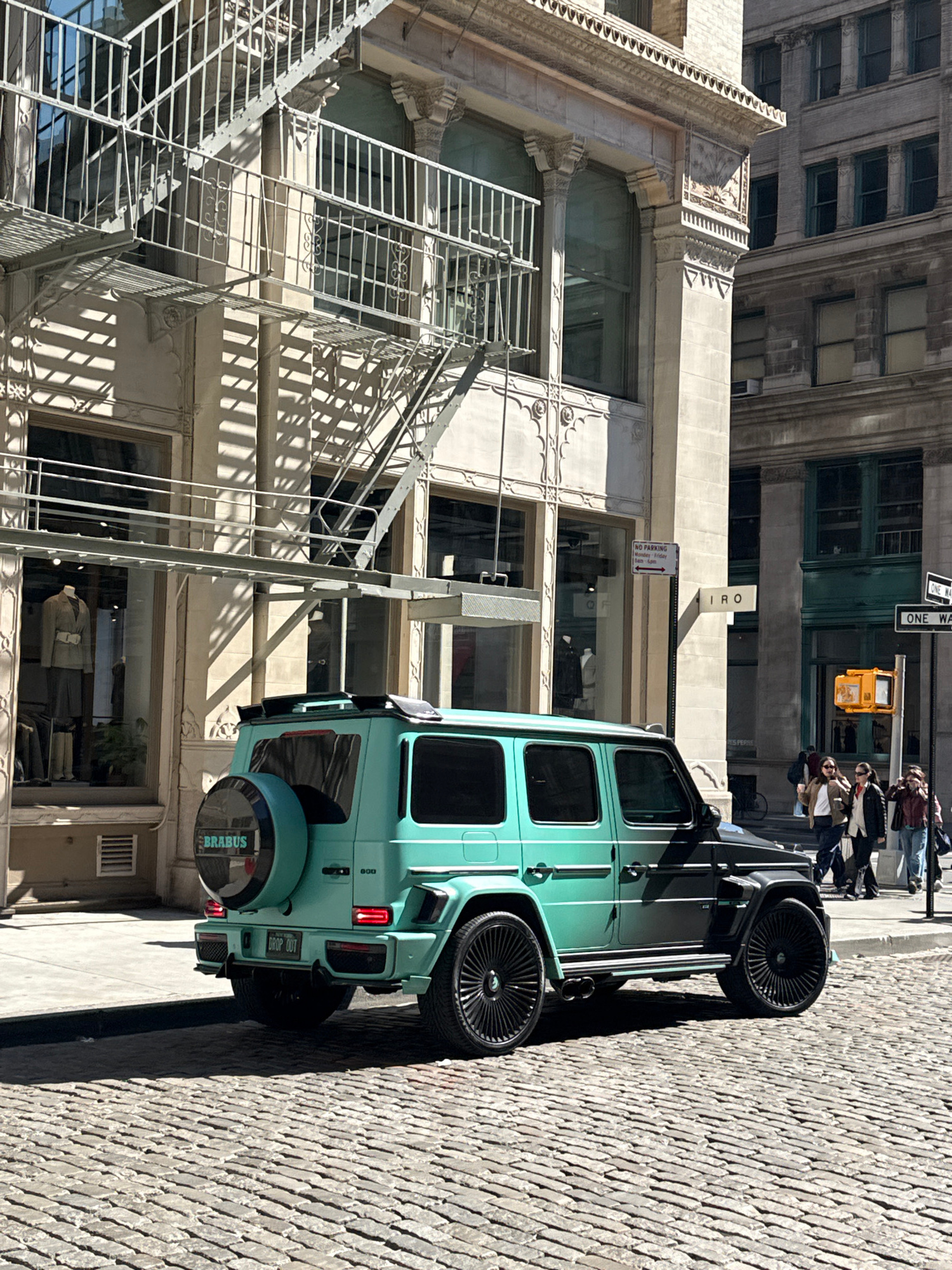 The image depicts a light-teal Brabus SUV parked on a cobblestone street next to a building with a fire escape in New York City. The building features architectural ornamentation and large windows dis…read more
