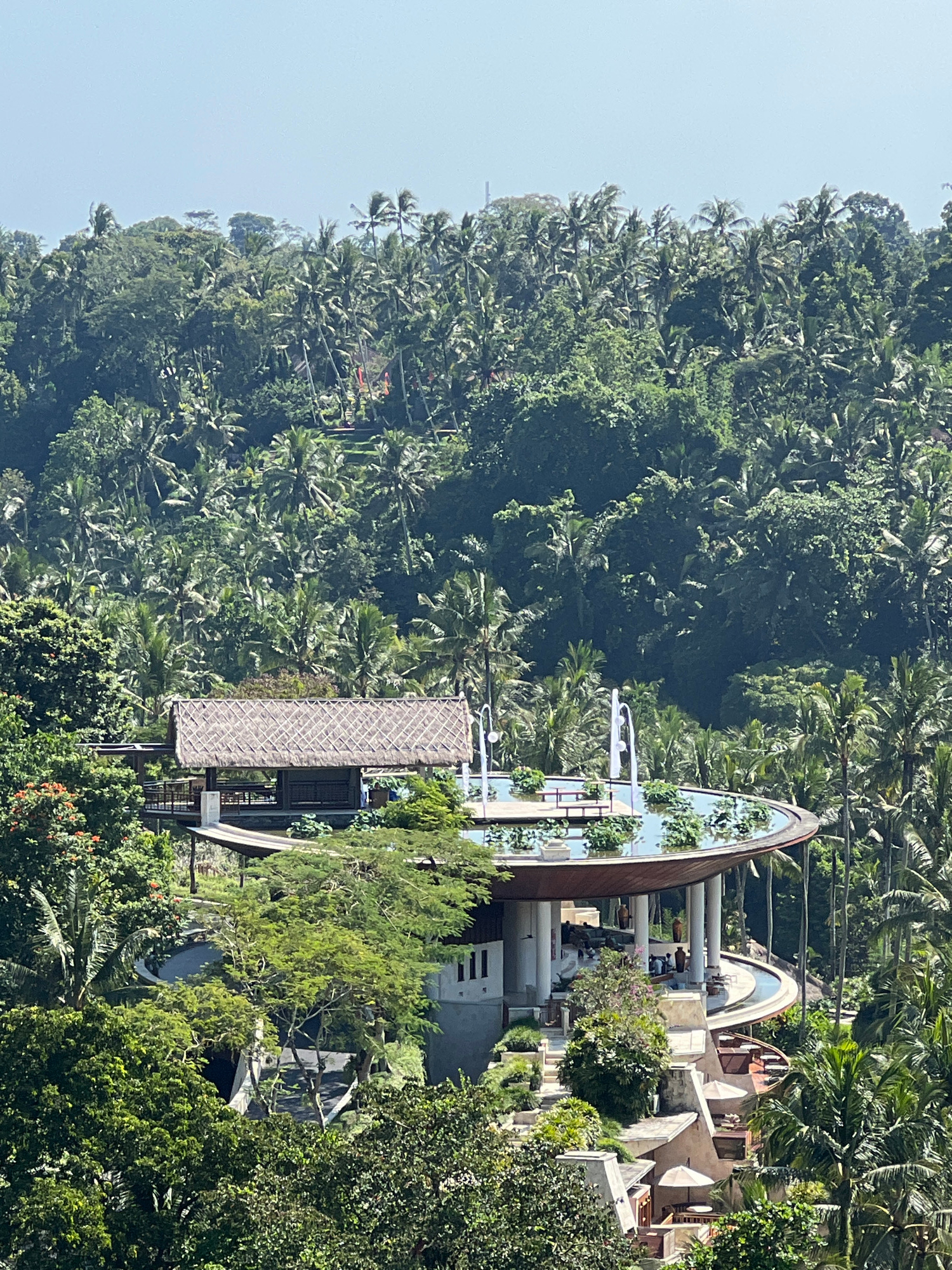 The image captures a scenic view in Sayan, Indonesia, dominated by lush, dense tropical forest covering the landscape. Interspersed within the foliage are structures suggesting a resort or private res…read more