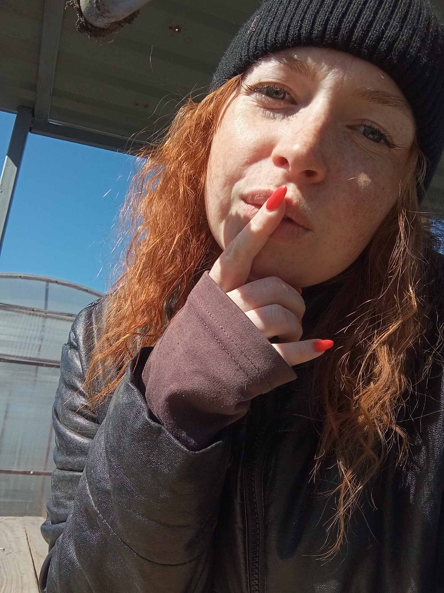 A woman with red hair and fair skin lies on her side, facing the camera. She wears a black knit beanie and a black leather jacket with a brown sleeve visible underneath. Her fingernails are painted br…read more