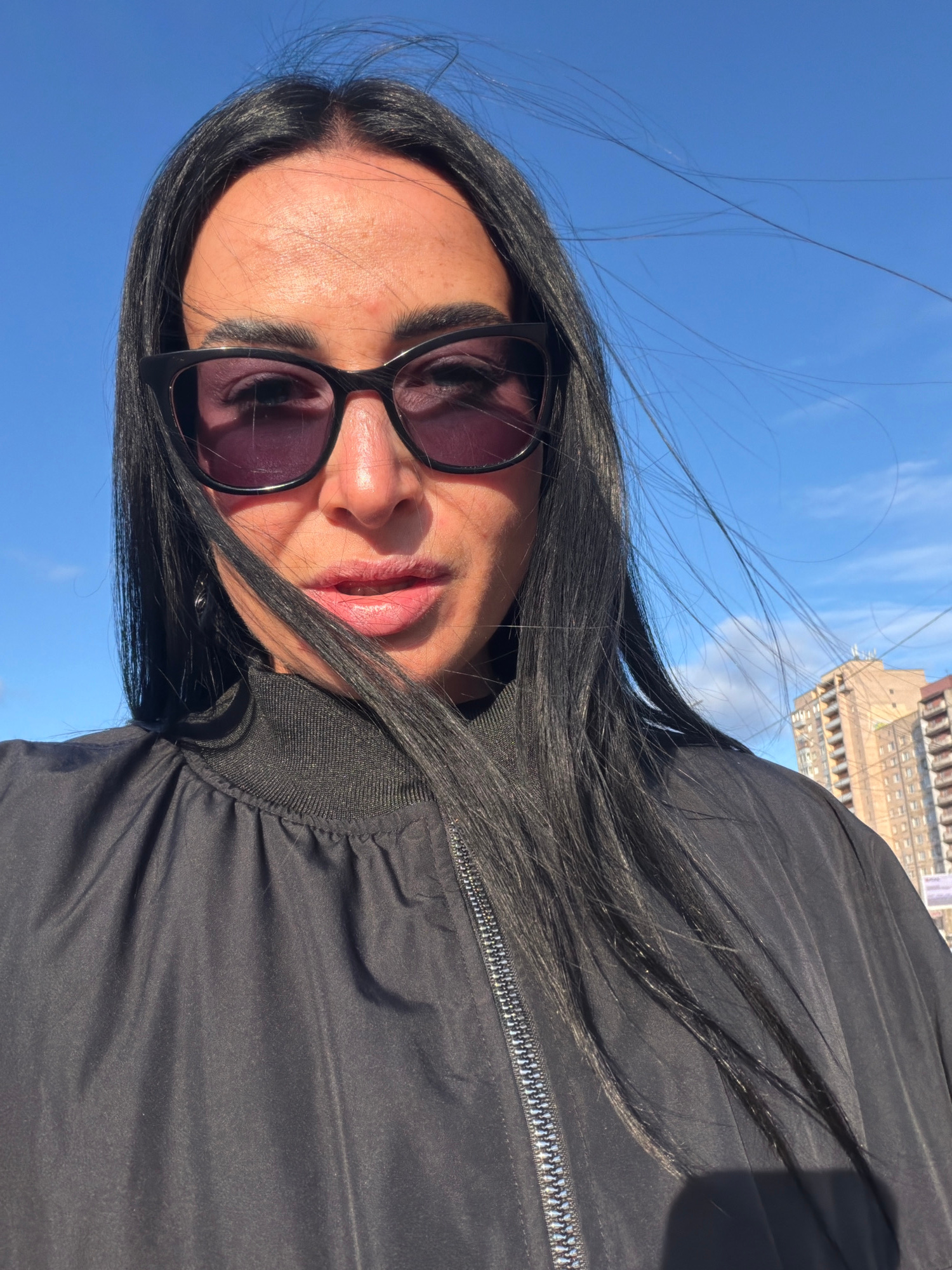 The image is a selfie taken by a person with long, black hair who is wearing sunglasses and a black jacket. In the background, the clear, blue sky is visible, as well as the Saint Petersburg Stock Exc…read more
