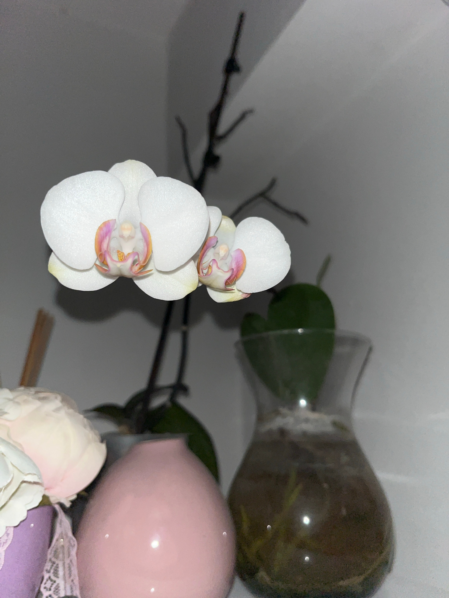 The image displays an indoor still-life arrangement featuring an orchid plant and decorative elements. The central subject is a phalaenopsis orchid with several white blossoms, each exhibiting delicat…read more
