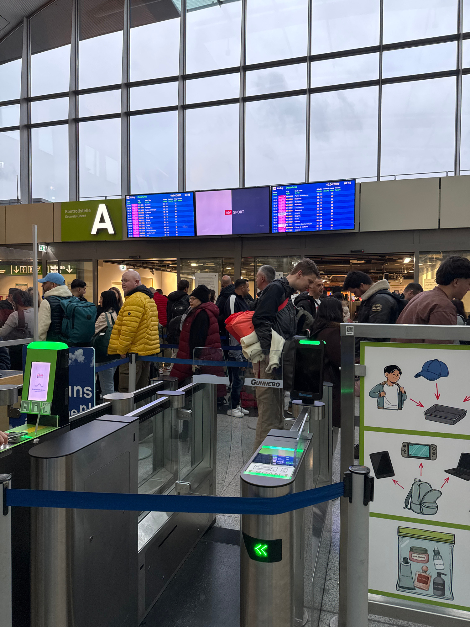 The image depicts a scene at an airport security checkpoint in Dortmund, Germany. A queue of people are waiting to pass through an automated security gate, managed by Gunnebo systems. Signage includes…read more