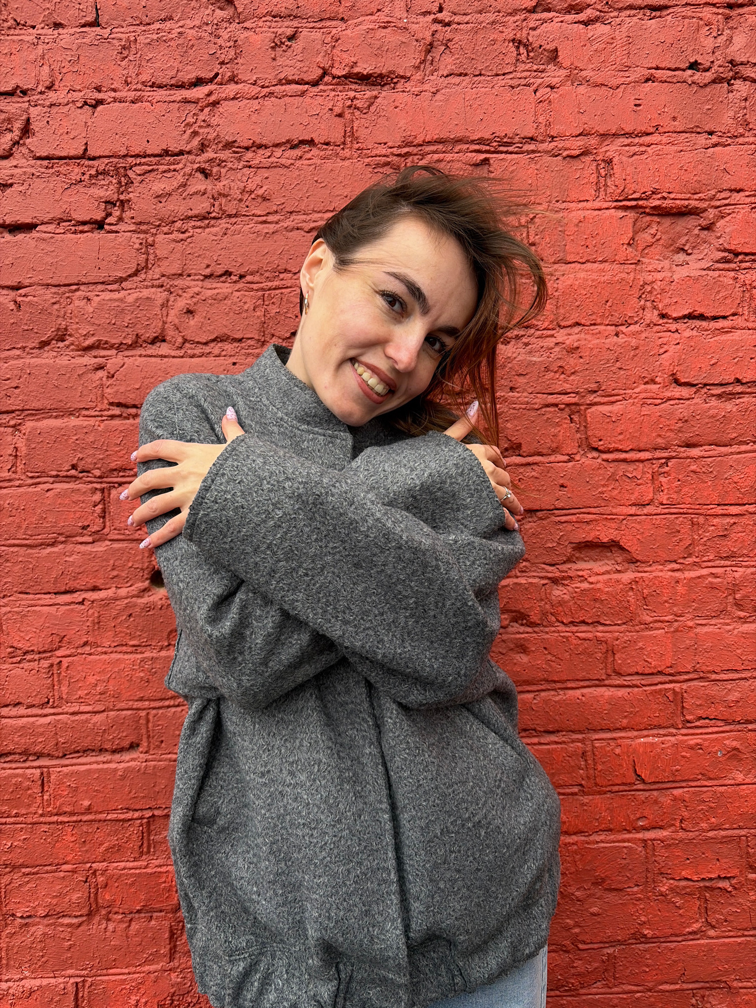 A young woman lies on a red brick surface. She is wearing a gray, textured jacket. Her hands are crossed in front of her. She is smiling and looking directly at the viewer. The setting appears to be o…read more