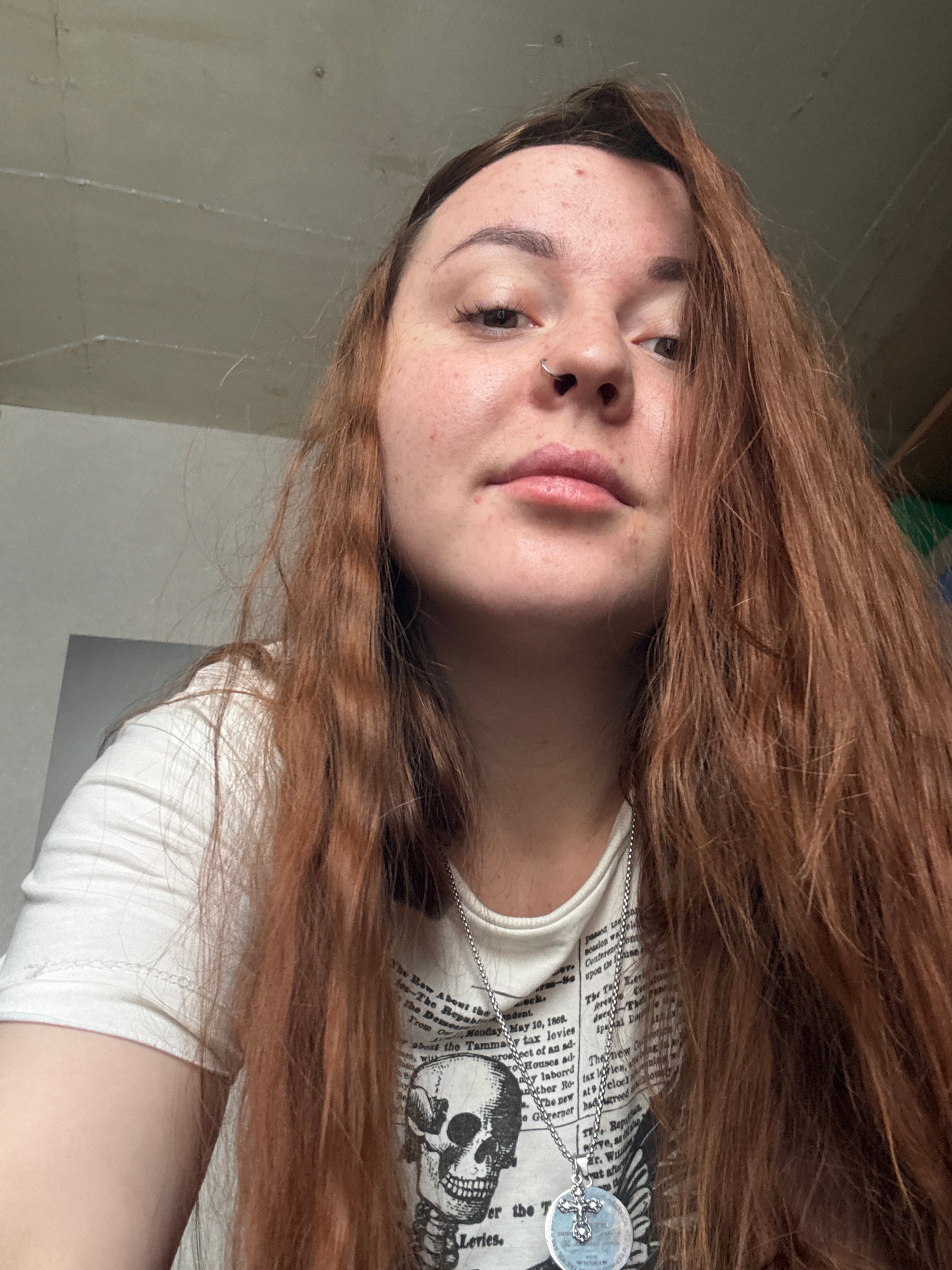 A close-up, tilted portrait shot shows a young person with long, light-brown, wavy hair partially obscuring the upper portion of the frame. The person has fair skin with some visible blemishes on thei…read more