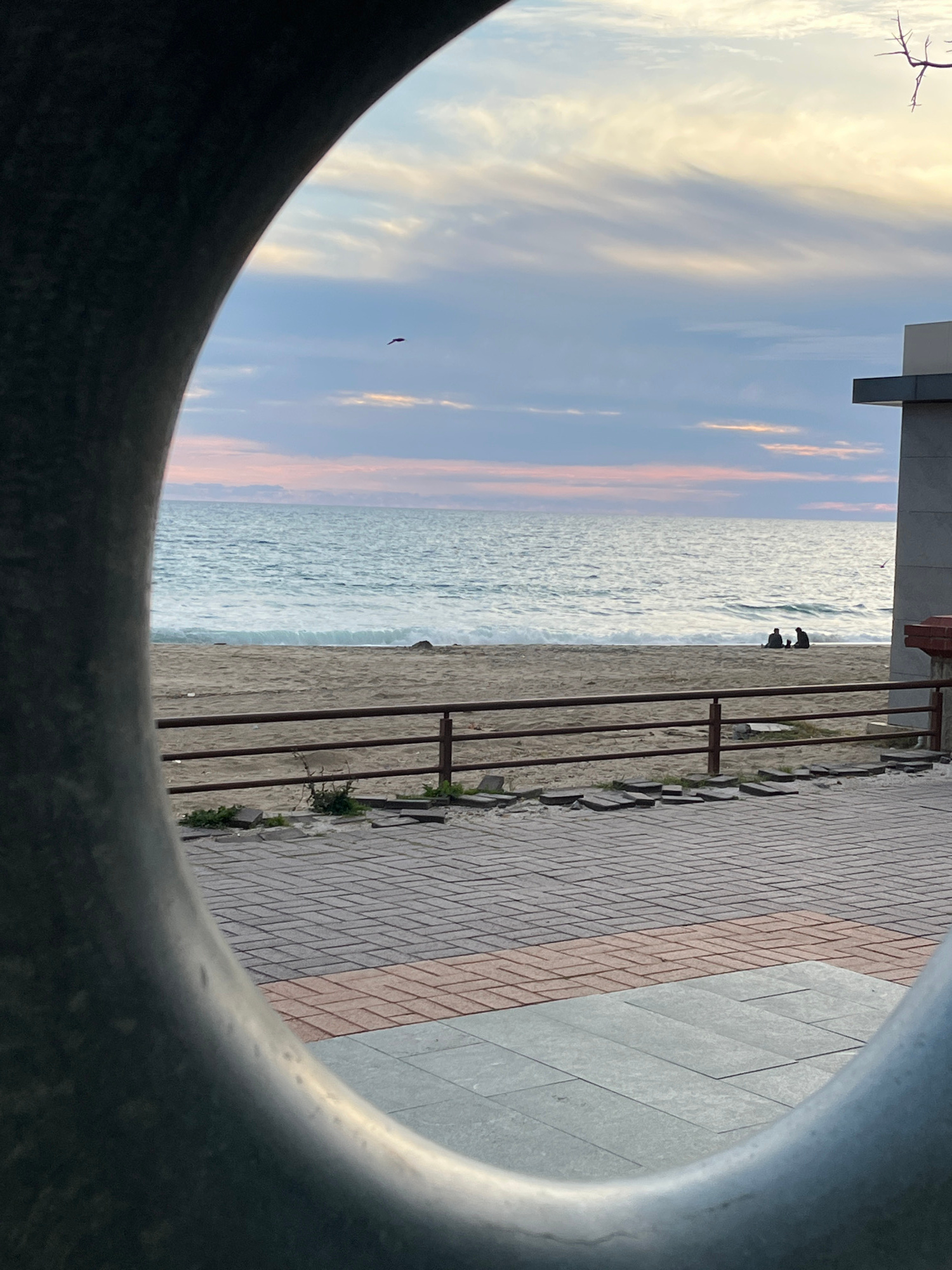 The image depicts a view of the beach and sea at Alanya, Turkey, as seen through a circular metallic structure. The sea is calm with some wave activity visible. Two dark figures, possibly people or bi…read more