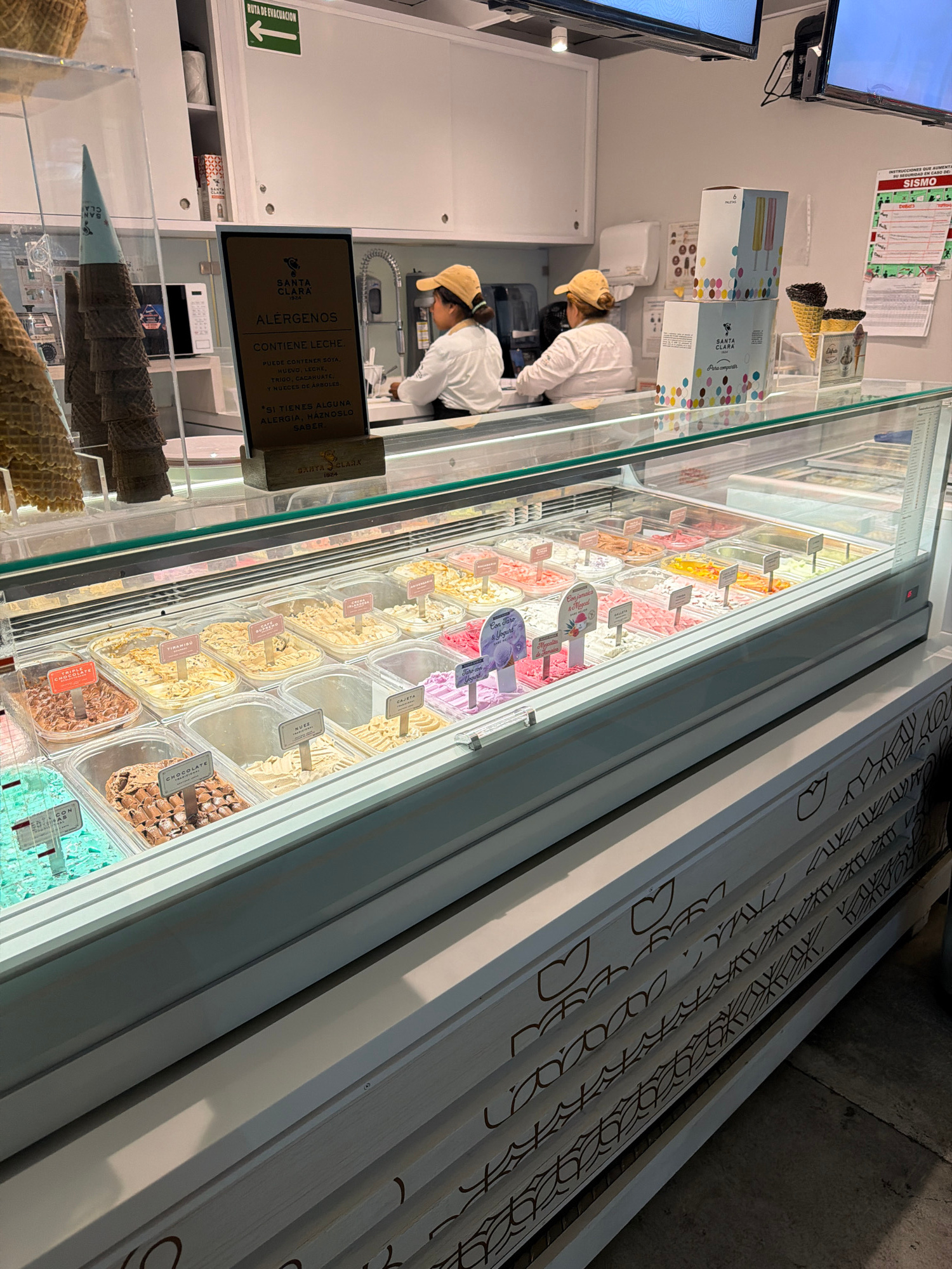 Here's a description of the image: The image shows the interior of an ice cream shop, likely in Cholula, Mexico based on the Spanish-language signage. Two employees wearing white coats and tan caps a…read more