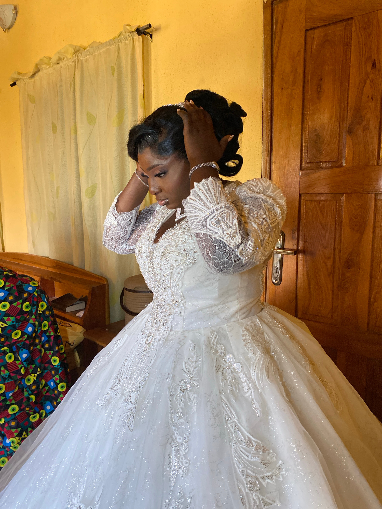 A woman stands in a room, dressed in a white wedding gown. She is holding her hair, likely adjusting her hairstyle. Behind her is a wooden door with a metal handle and a curtained window. The photogra…read more