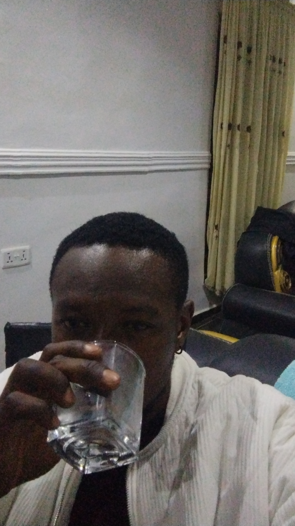 A person is drinking from a clear glass indoors. The person has dark skin and short, dark hair. They are wearing a white jacket with a zipper. The background includes a gray wall with molding, an elec…read more