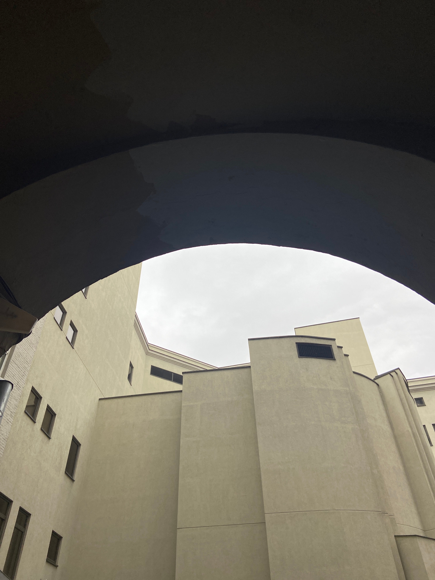 The image is a low-angle shot looking up at a building facade with a large, dark, circular structure partially obscuring the view on the left. The building is a light beige color, with a series of rec…read more