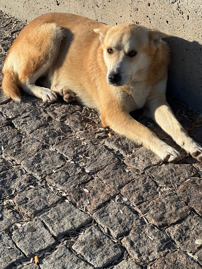 A medium-sized dog with light tan and cream-colored fur lies on a cobblestone pavement, positioned against a light grey concrete wall or curb. The dog's head is slightly raised, and it looks directly…read more