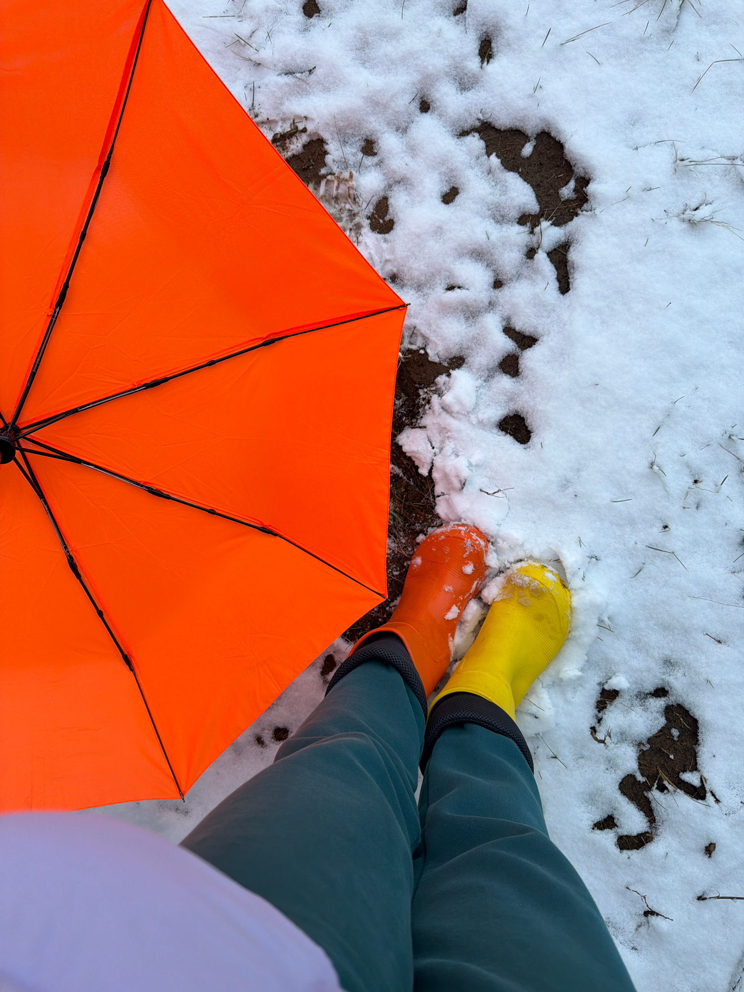 A person in orange and yellow rubber boots stands in snow with an orange umbrella. The person is wearing green pants and a white shirt. The ground is partially covered in snow. The photograph was take…read more