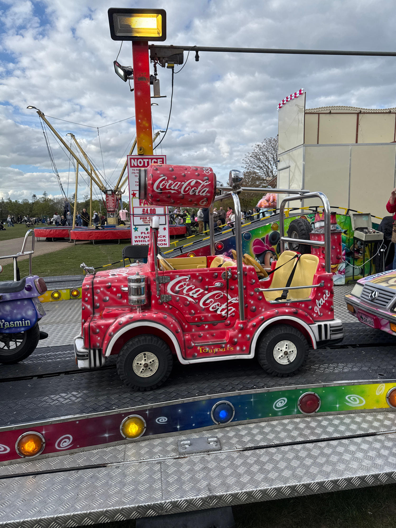 The image depicts a children's fairground ride, specifically a circular track with vehicles and motorcycles. A prominent feature is a red car adorned with Coca-Cola branding. Other vehicles, including…read more