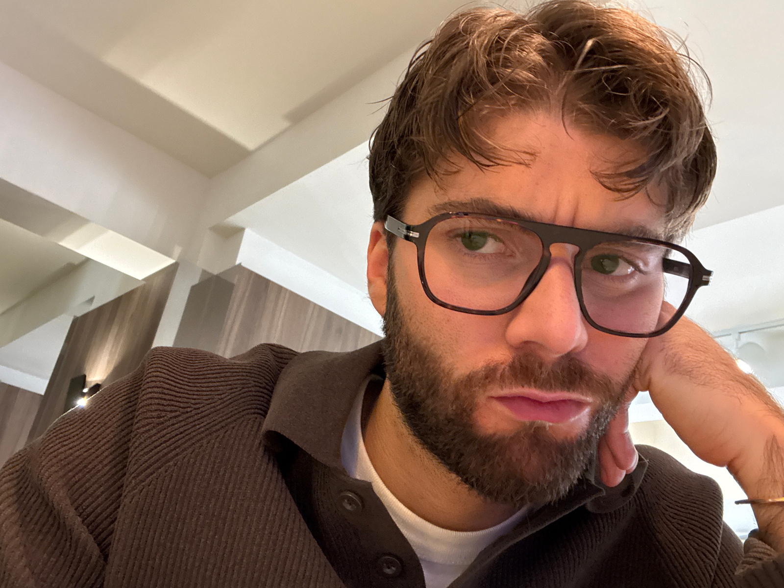 The media file displays a close-up, low-angle shot of a man's face, rotated 90 degrees counter-clockwise, giving an impression of him looking down at the camera. The man, with a well-maintained brownβ¦read more