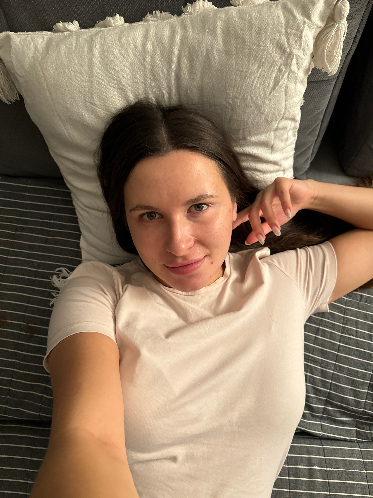 A young woman with dark hair and light skin is lying on a couch. She is resting her head on a white pillow with tassels. The couch has gray and white striped cushions. She is wearing a light-colored t…read more