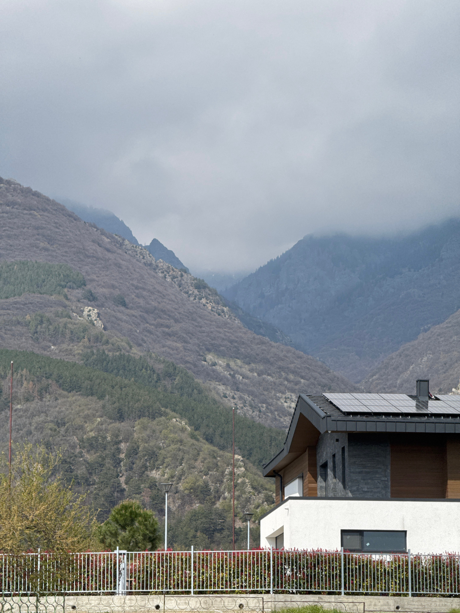 The image depicts a view of a modern house nestled against a forested mountain slope under an overcast sky. The house has white walls, dark-framed windows, and a section with solar panels. A metal fen…read more