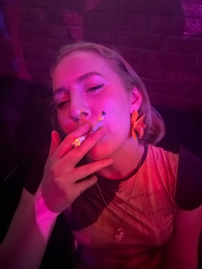 A young woman reclines under pink and purple lighting. She holds a lit cigarette in her left hand near her face, while a flower adorns her hair near her ear. Her eyes are closed, and a glittery detail…read more