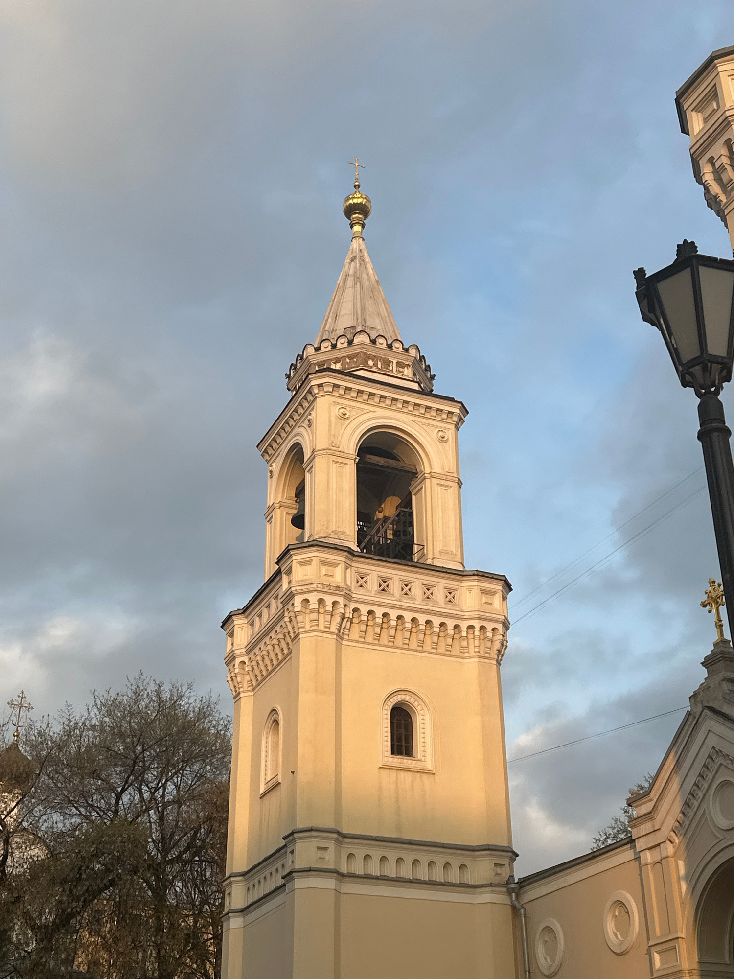 A tall, ornate bell tower of an Orthodox church dominates the central and right portions of the image, bathed in warm, directional sunlight suggesting late afternoon or early evening. The tower is con…read more