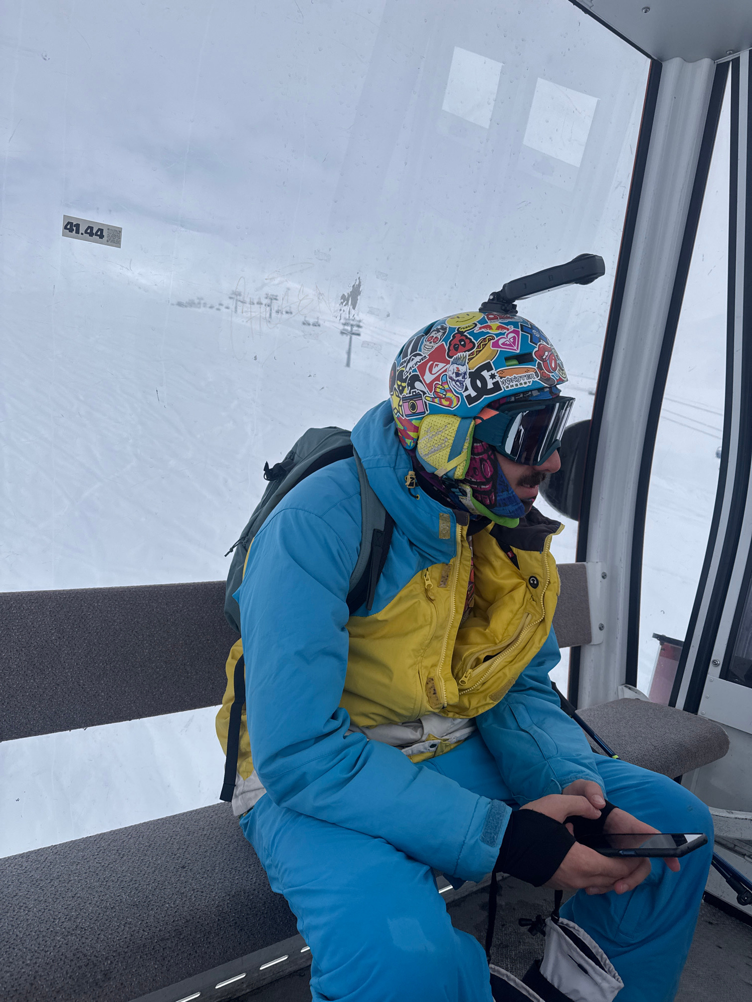 A person is seated inside a cable car or gondola. The individual wears a sticker-covered helmet with an attached action camera, ski goggles, a blue jacket with a yellow interior, and blue pants. They…read more