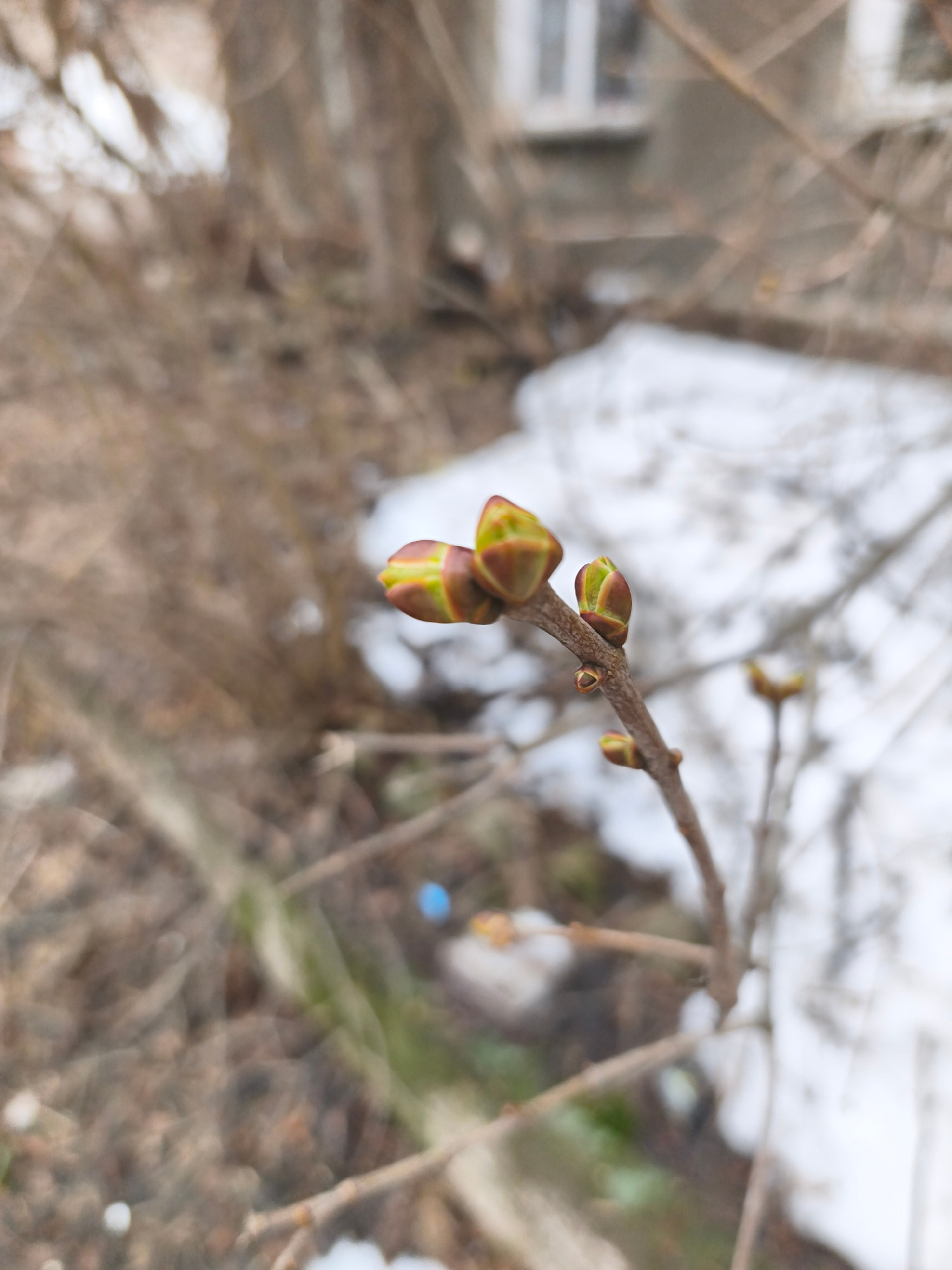 The image features a close-up of tree buds on a branch, with a blurry background showing remnants of snow and a building. The buds are starting to show green, indicating the beginning of spring. The e…read more