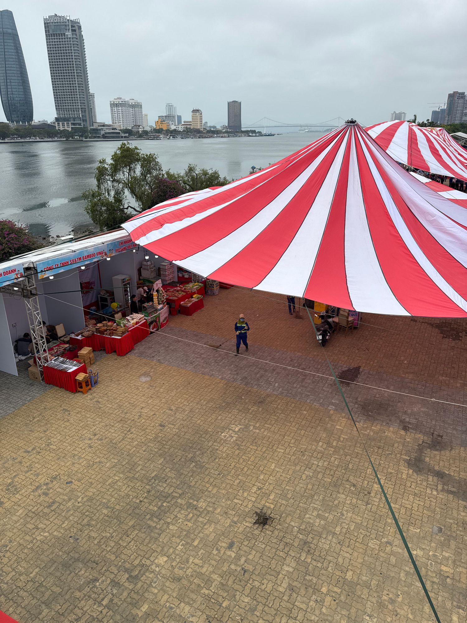 Here is a detailed description of the image: The image captures a street market scene located in Đà Nẵng, Vietnam. The vantage point is from above, looking down at the market area which is covered by…read more