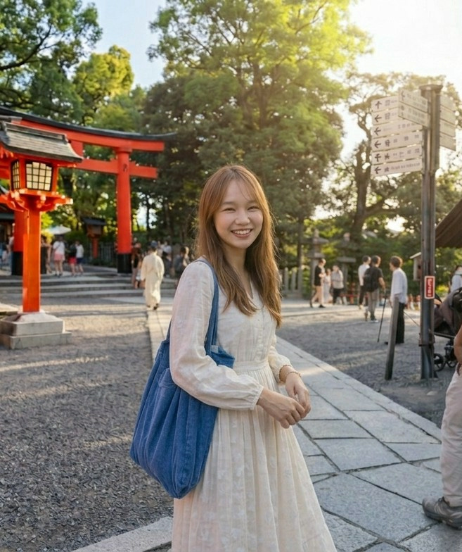The image depicts a young East Asian female in the foreground, smiling directly at the viewer, positioned on a paved stone and gravel path. She has long, light brown hair with bangs and is wearing a l…read more