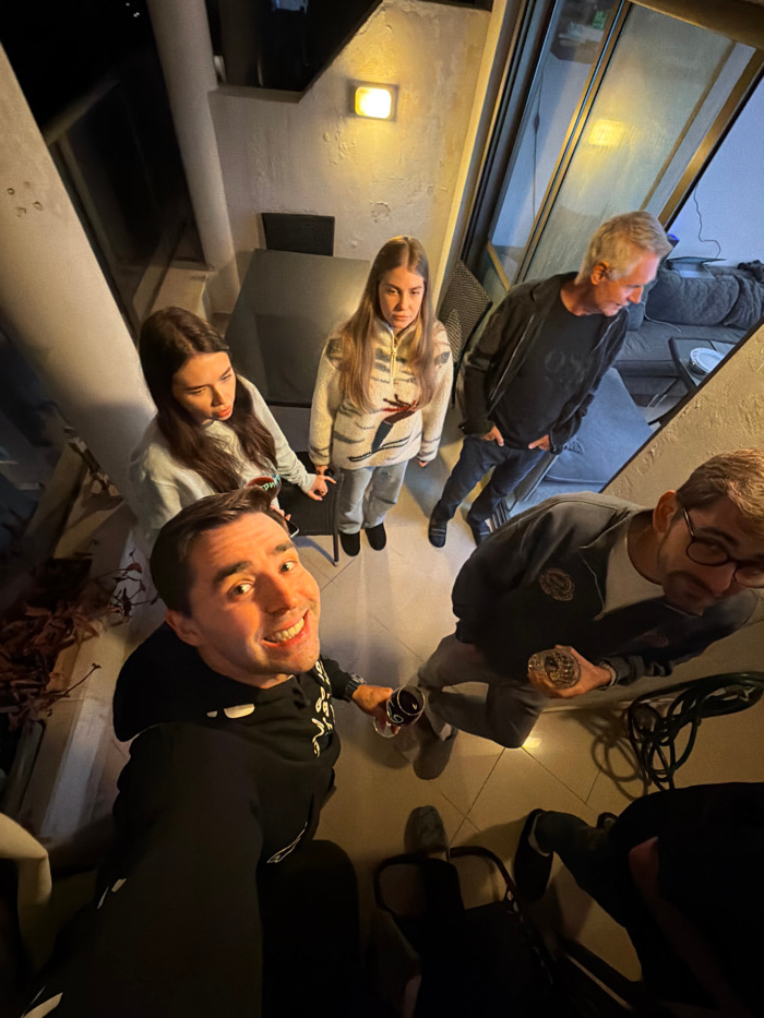 Five people are shown in an unusual upward-angled group shot. An older man in a black jacket, a man with glasses holding a drink, and the person taking the photo holding a glass of wine fill the frameβ¦read more