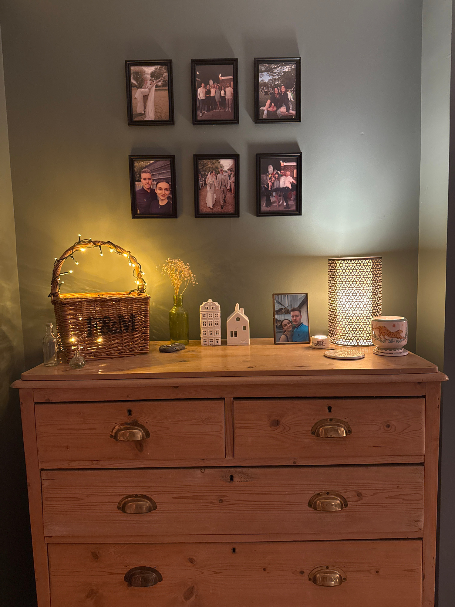 A wood dresser is positioned to the right of the frame. On top of the dresser, there is a lamp, picture frames, decorative houses, flowers in a vase, and a basket wrapped in lights. To the left of the…read more