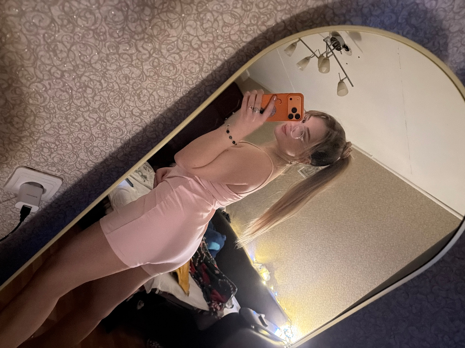 The image shows a woman taking a selfie in a mirror. The mirror has a gold frame and reflects a room interior. The woman is wearing glasses and a pink outfit. Her hair is in a high ponytail. She is ho…read more