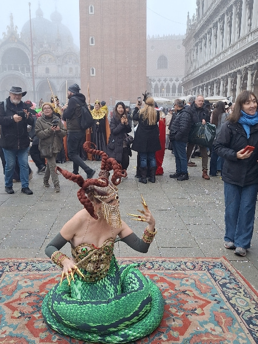In a public square obscured by fog, a woman in a vibrant green snake costume poses on an ornate rug. Her outfit includes long, golden nail extensions, a gold headpiece, and brown snake-like extensions…read more