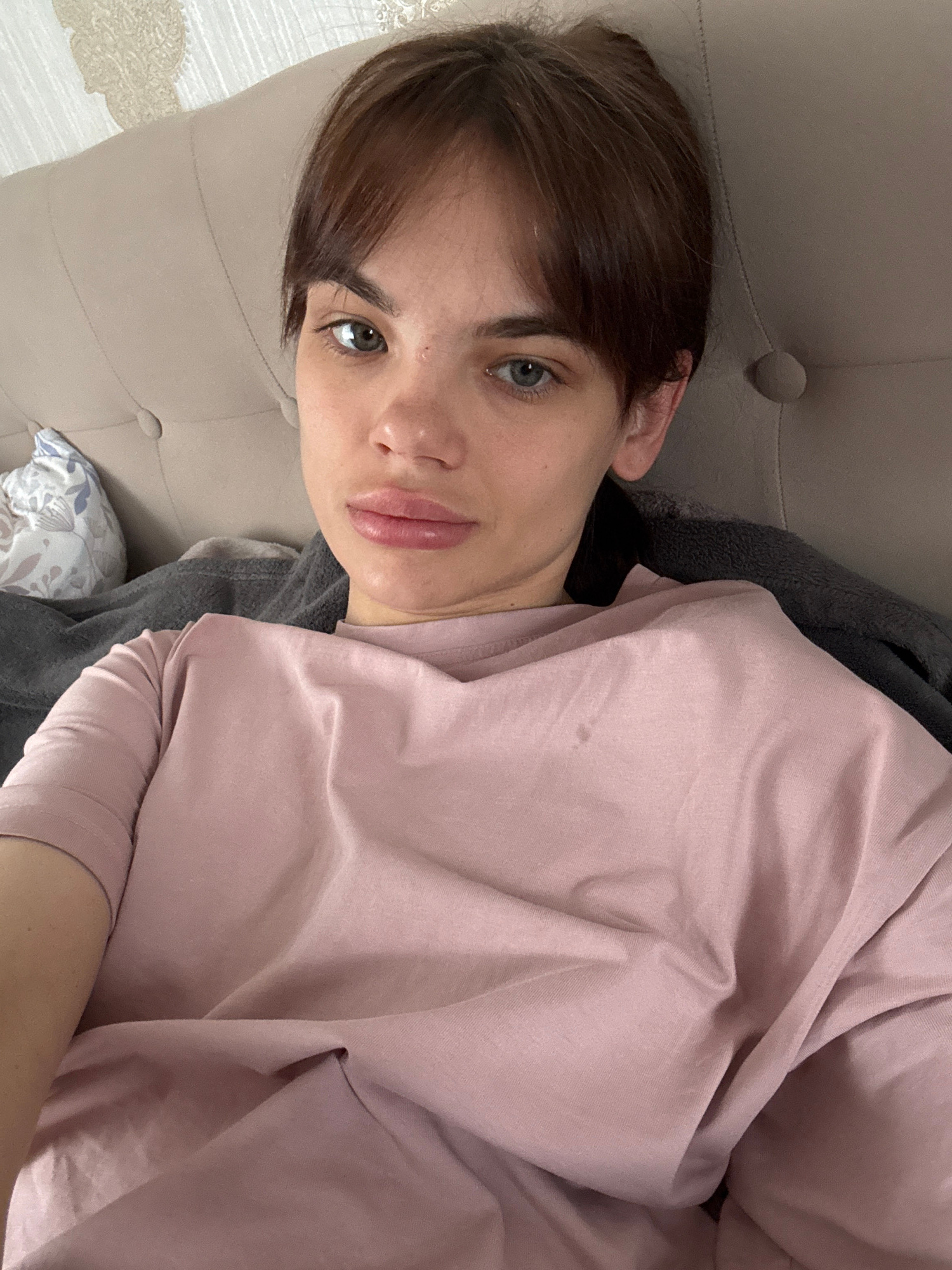 A woman with short brown hair is lying down. She has fair skin and light-colored eyes. She is wearing a pink long-sleeved shirt. She is lying on a light-colored tufted couch with a gray blanket undern…read more