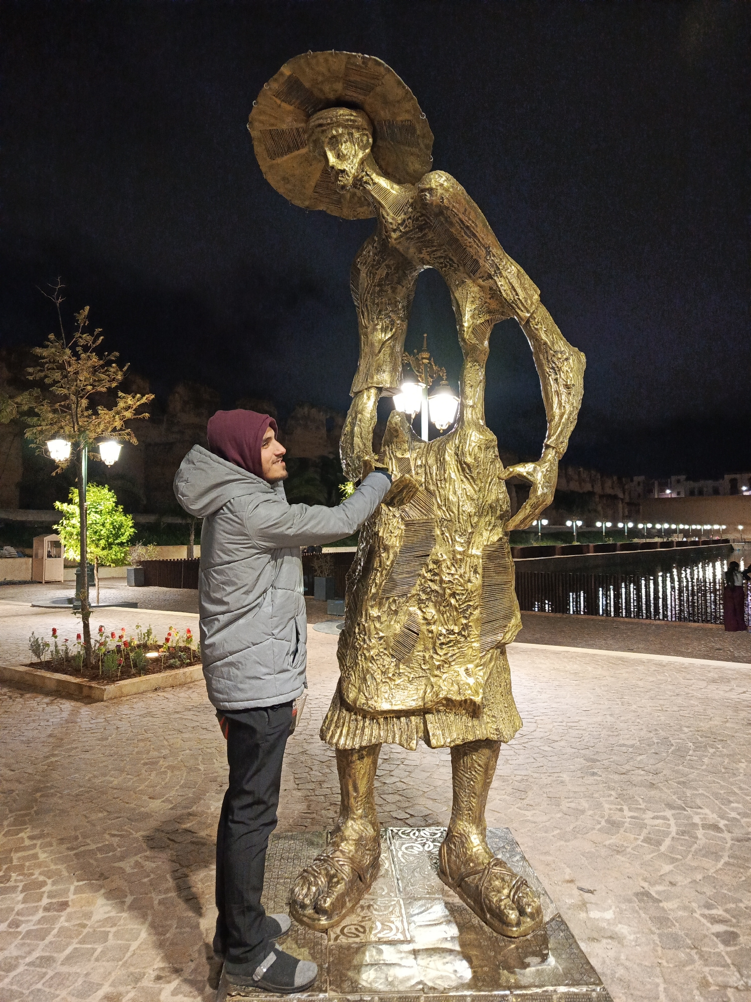 The image captures a man standing next to a large golden sculpture in a public space at night. The man is wearing a grey hooded jacket and dark trousers. He is looking at the sculpture and has his han…read more
