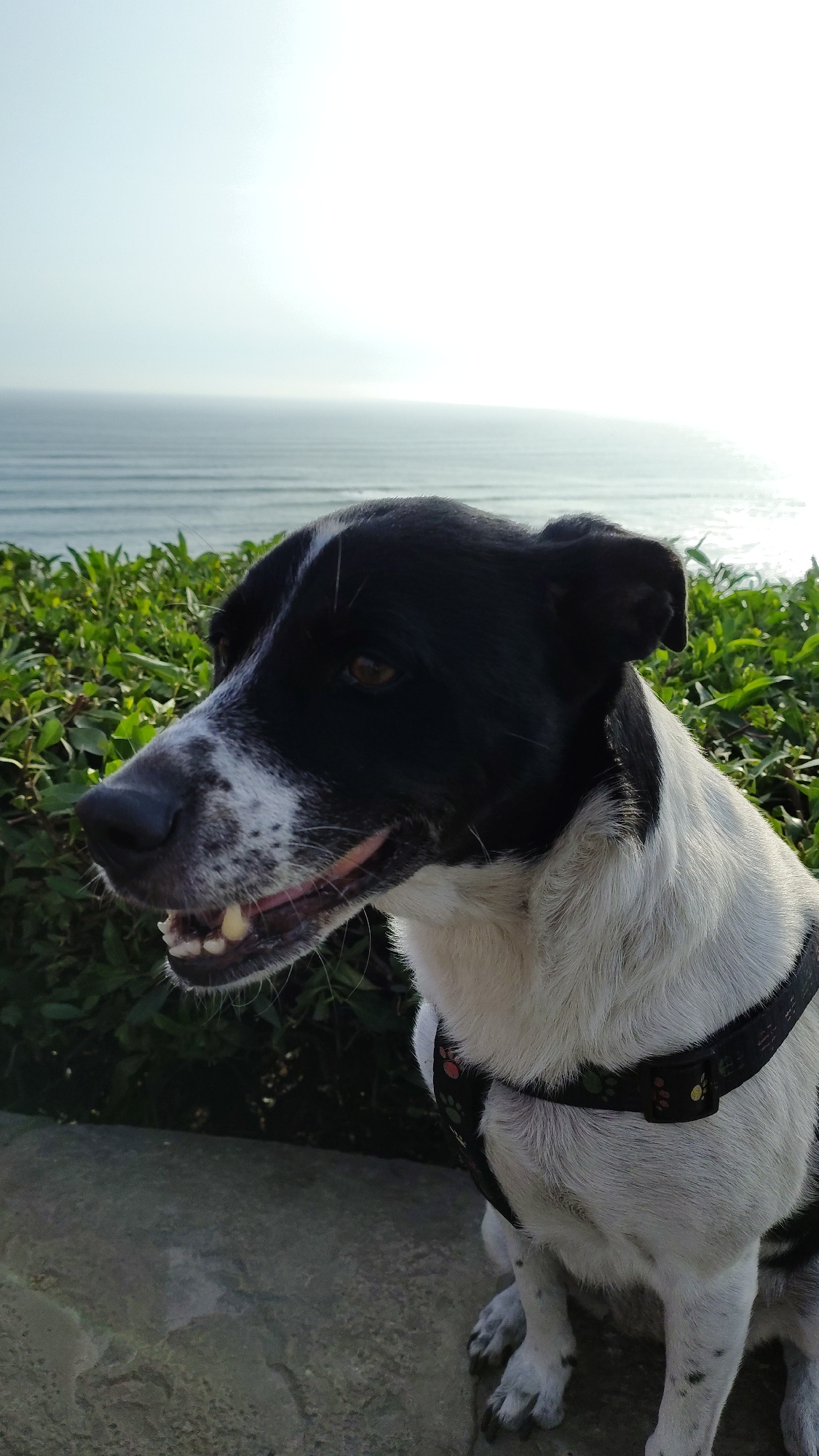 The image depicts a black and white dog with a harness lying near green vegetation and a body of water, possibly the Pacific Ocean. In the background, the horizon is visible with a bright, slightly ha…read more